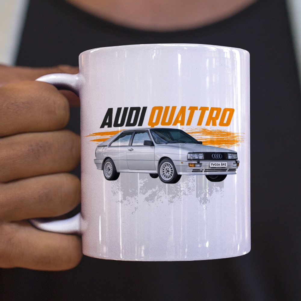 Niet nad klasiku! Daruj praktický keramický hrnček s motívom kultového auta AUDI QUATTRO s možnosťou doplnenia ŠPZ (dopíš do poznámky…)